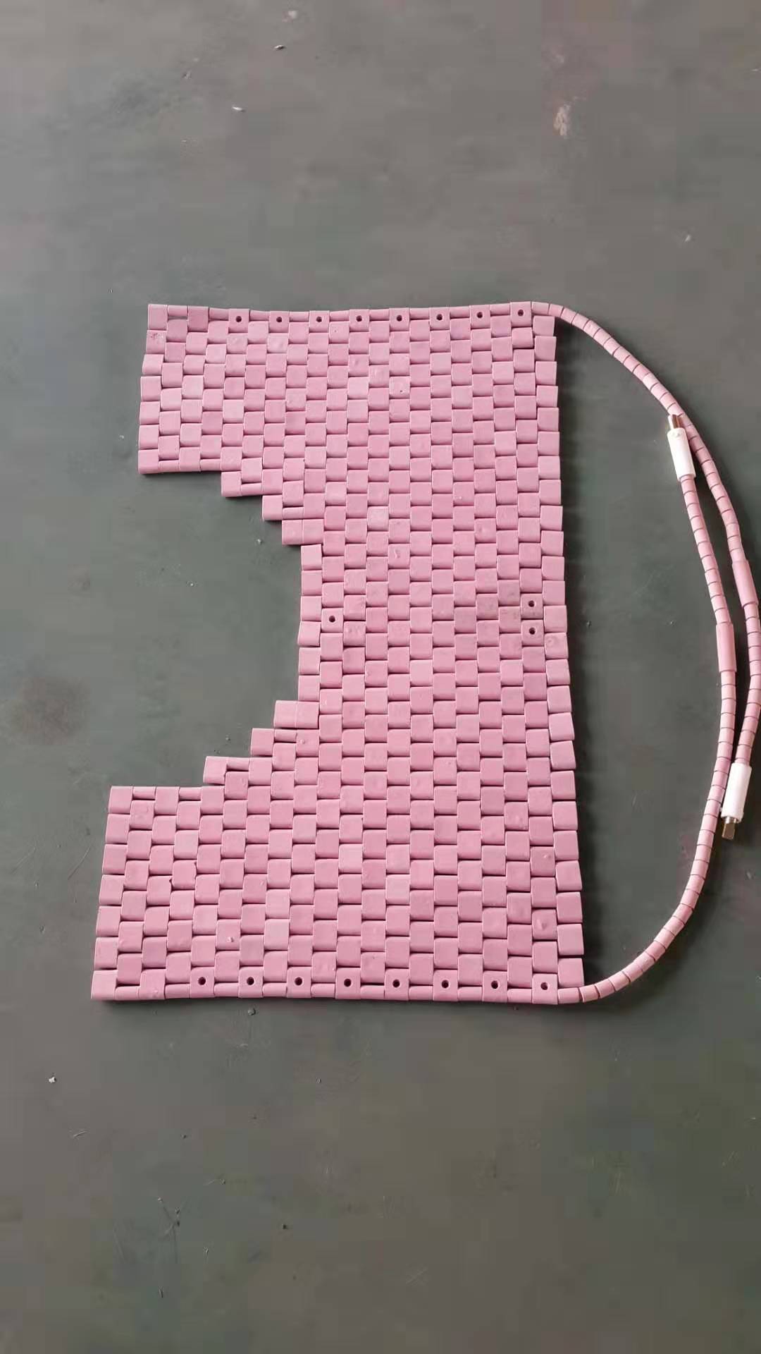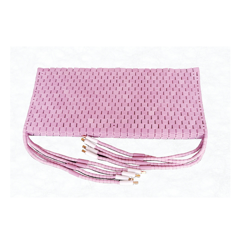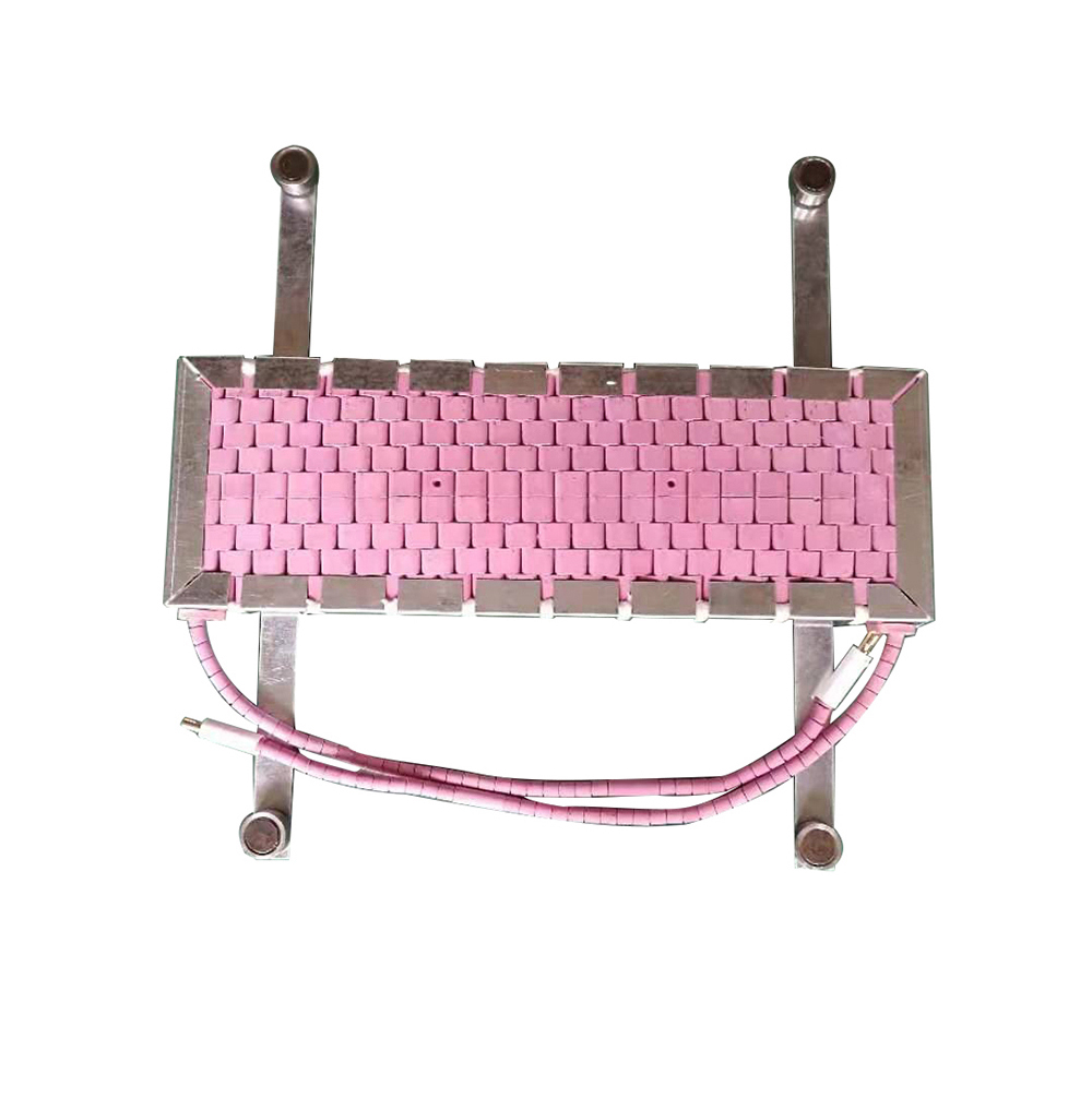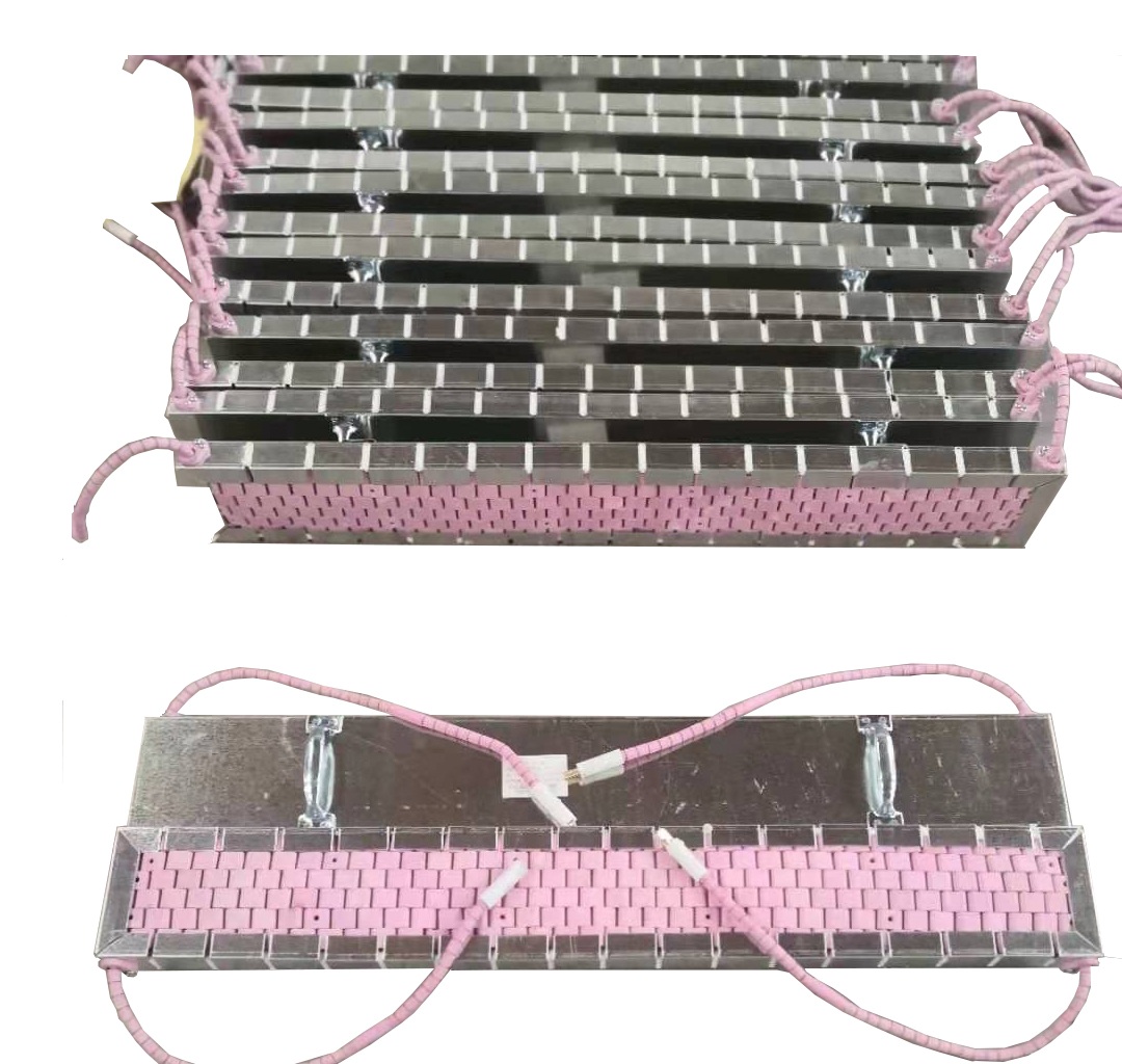 選用鎳烙絲纜作發熱源,高純度氧化鋁陶元件為絕緣體制成不同形狀的履帶式加熱器,并視工件的幾何形狀壁厚選擇相應的規格。